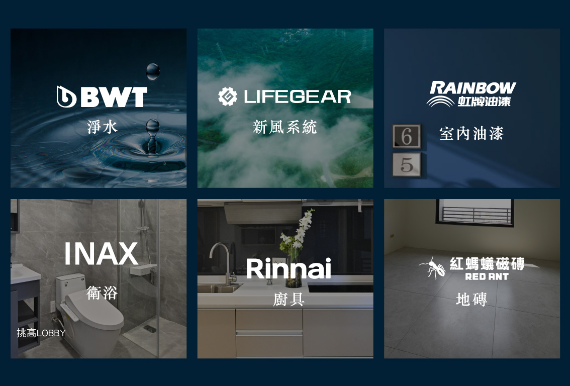 東高建設用心把關居住品質,為您細選品味,嚴選六大知名品牌建材打造優質好宅。居家配備德國「BWT淨水」設備與「LIFEGEAR新風系統」,為家人的純淨水質與清新空氣嚴格把關。室內裝修採用無毒環保的「RAINBOW虹牌油漆」與高品質「紅螞蟻地磚」,構築安心健康基底。廚衛空間更引進日本精品,包含「Rinnai廚具」及「INAX衛浴」設備。從呼吸、飲水到日常起居,完美提升您的居住質感。