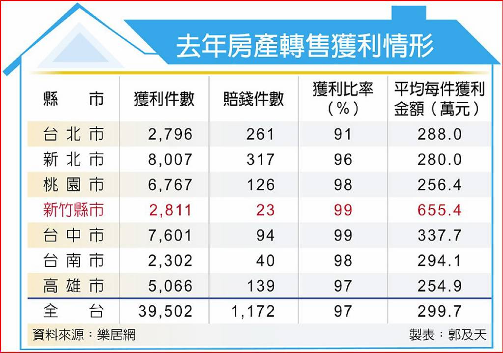 近年房價持續上揚,即使政府祭出多項調控措施,不過轉售房產獲利仍然驚人,去年約有近4萬件房產轉售獲利,僅有不到1,200件轉售賠錢,轉售獲利比高達97%,全台平均每件轉售房產獲利近300萬元,近年房價飆漲的新竹房產獲利更高達655萬元。